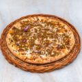 Tomatsaus, ost, pepperoni, kjøttdeig, sjampinjong, fersk salat, mais, hvitløkssaus