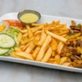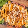 Pommes frites med marinert biff, cheddar saus, kebab dressing, mais,...