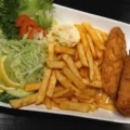 Pommes frites med fritert torsk, coleslaw, løk, tomat, agurk, salat...