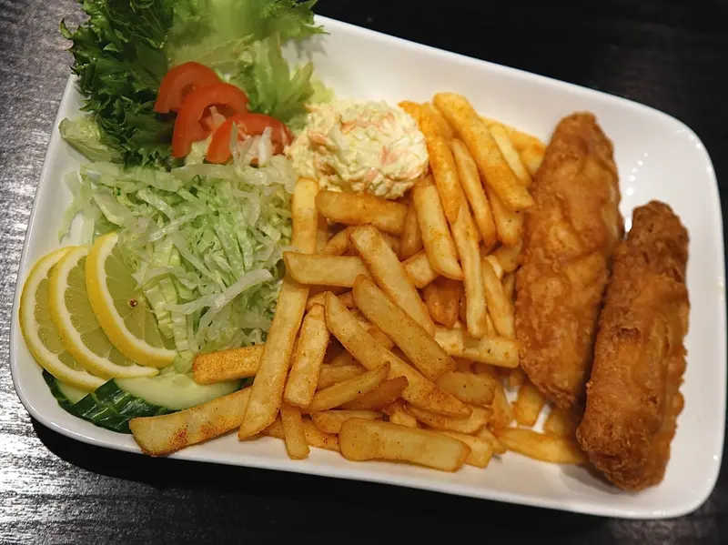 Pommes frites med fritert torsk, coleslaw, løk, tomat, agurk, salat og sitron.