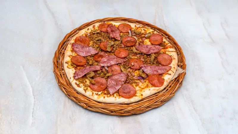 Tomato sauce, cheese, pepperoni, ham, beef, minced meat, onion, bacon