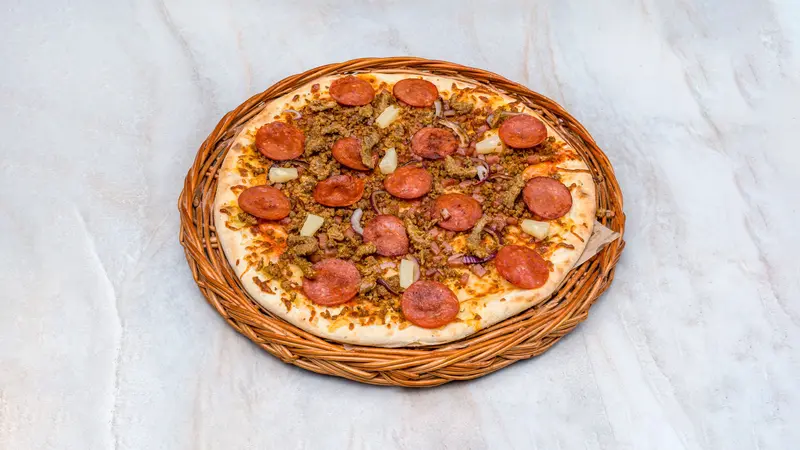 Tomato sauce, cheese, pepperoni, ham, minced meat, beef, pineapple