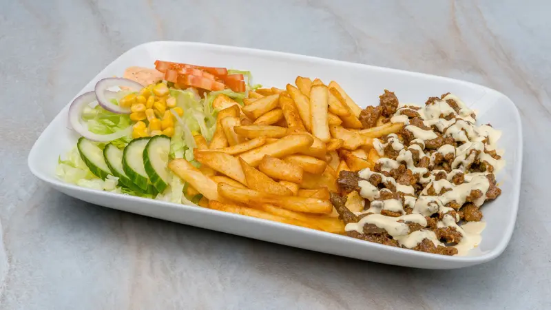 Marinert biff, marinert kylling, kuttet brød, salat, tomat, agurk, pommes frites, hvitløksaus og sterk saus