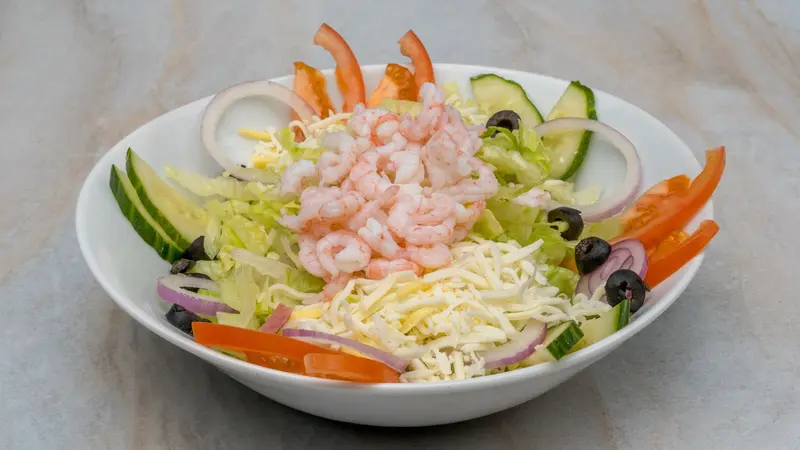 Salad, shrimp, cheese, olives, onion, dressing