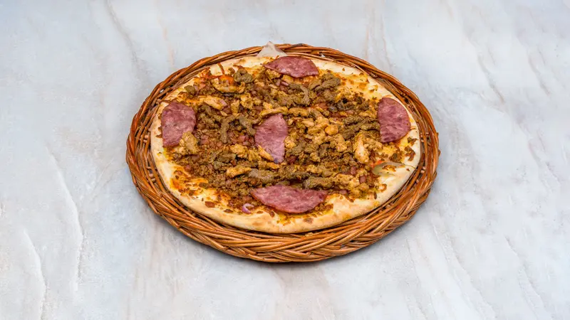 Tomato sauce, cheese, ham, beef, chicken, bacon, minced meat